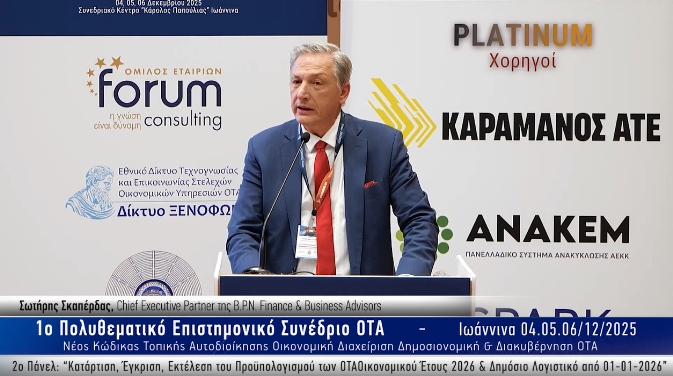 Με ιδιαίτερη επιτυχία πραγματοποιήθηκε το 1ο Πολυθεματικό Επιστημονικό Συνέδριο ΟΤΑ στο Συνεδριακό Κέντρο «Κάρολος Παπούλιας» στα Ιωάννινα, με συνδιοργανωτές: τον Όμιλο εταιρειών Forum Consulting, το Εθνικό Δίκτυο Τεχνογνωσίας & Επικοινωνίας Στελεχών Οικονομικών Υπηρεσιών ΟΤΑ «Δίκτυο ΞΕΝΟΦΩΝ» και τον Δήμο Ιωαννιτών. Ο Επικεφαλής Εταίρος κος Σωτήρης Σκαπέρδας της συμβουλευτικής...